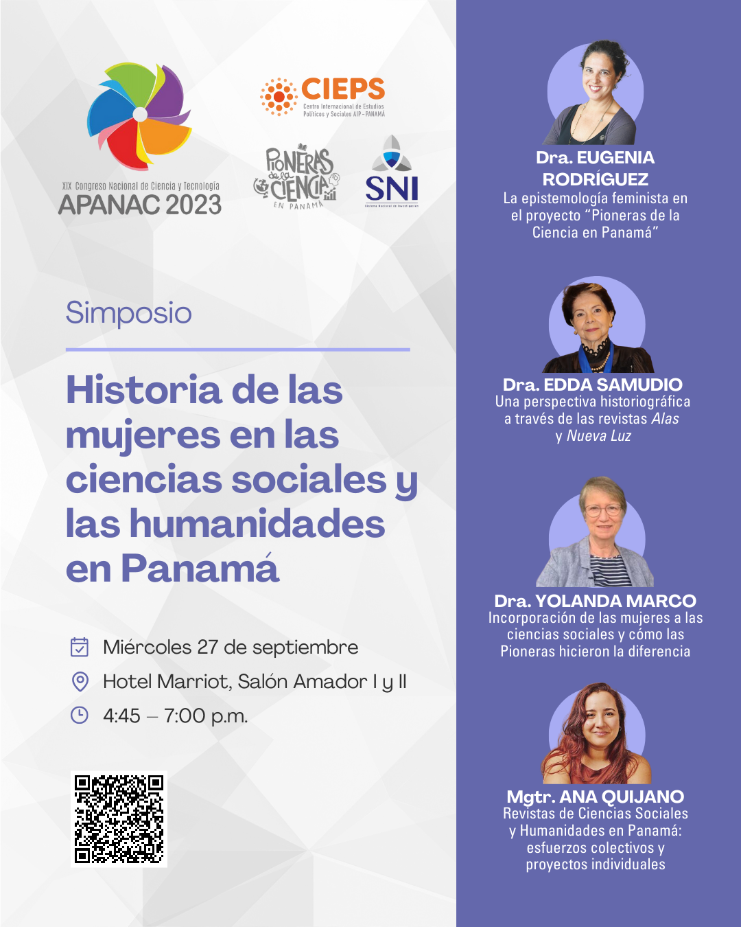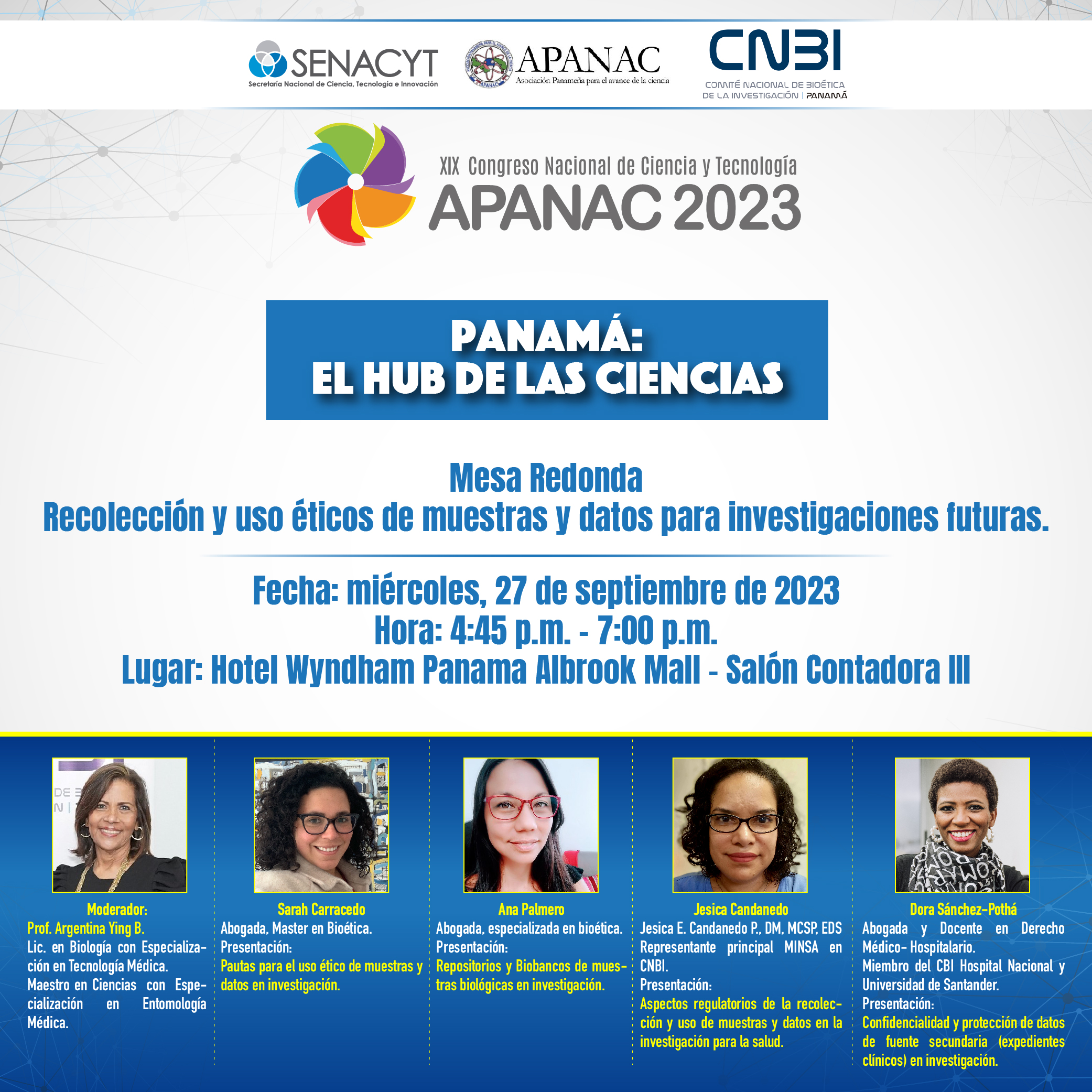 La Asociación Panameña para el Avance de la Ciencia (APANAC) se complace en anunciar su XIX Congreso Nacional de Ciencia y Tecnología llevado a cabo del 26 al 29 de septiembre de 2023 que tiene como idea central “Panamá, Hub de las Ciencias”. Este lema proyecta la visión de país que aspiramos a través del desarrollo de la ciencia y nuestra capacidad instalada para la transferencia de conocimiento. Para ello vamos a promover nuevos canales a nivel internacional, nacional, regional, provincial y municipal que nos permitan determinar las demandas reales de nuestra sociedad y de la región.